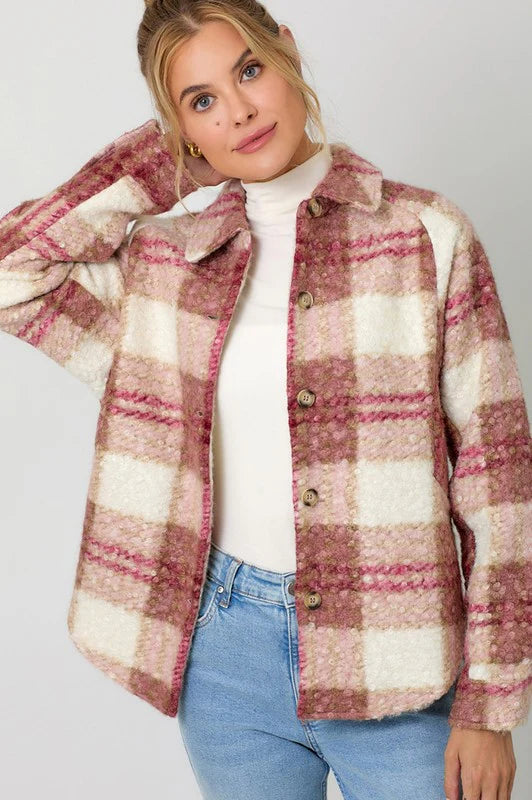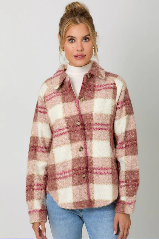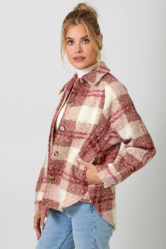 Introducing the Janelle Plaid Button Down Shacket! This unique and fashionable piece features a hi-lo hem and convenient side pockets, all in a playful rose/tan/white color way. The perfect layering piece for those chilly spring nights!